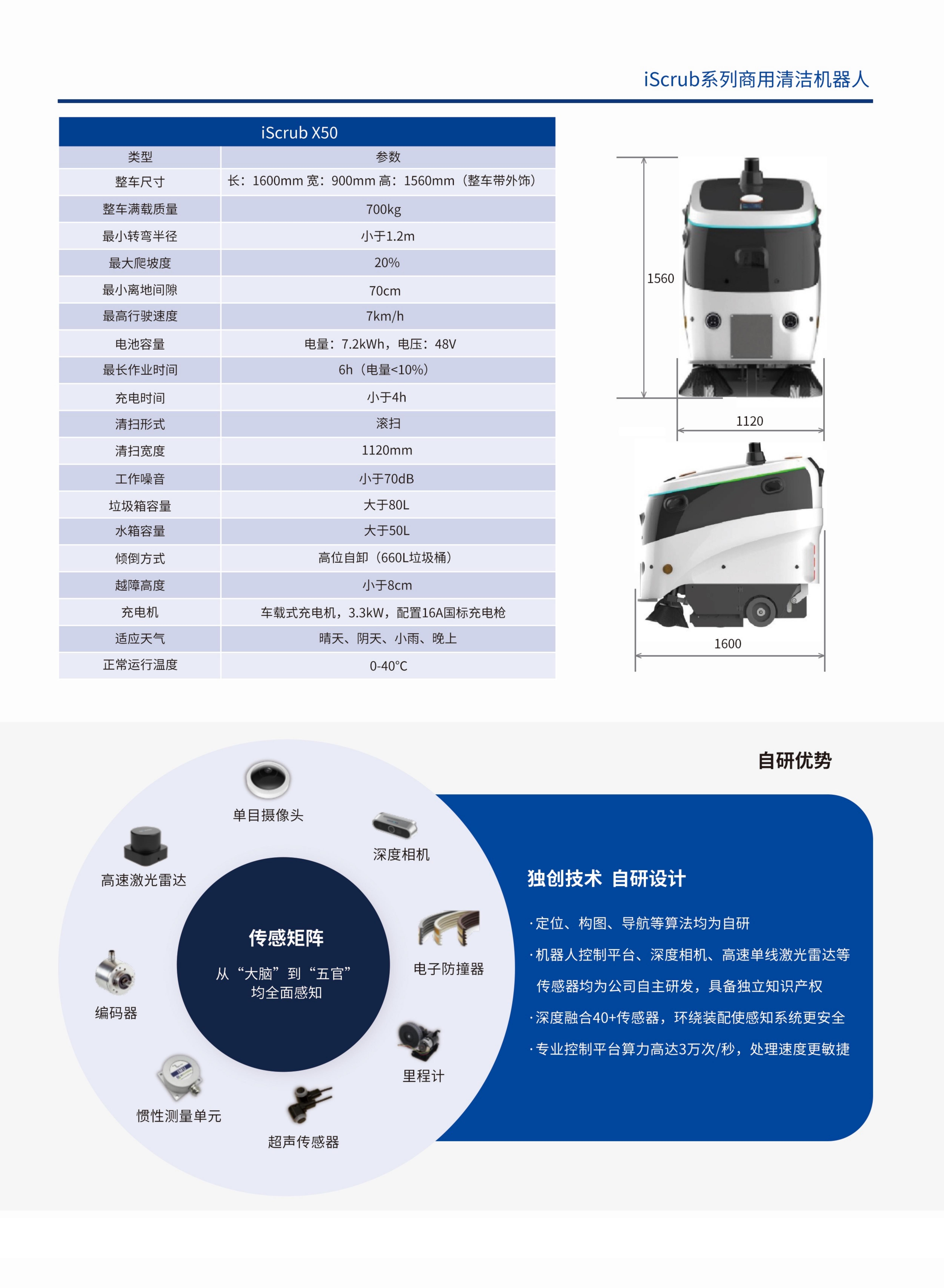 无人驾驶清扫车iScrub X50是一款以L4级无人驾驶技术为核心,融合视觉、超声波、激光雷达等多模态传感器,实现无人驾驶、智能避障绕行、 自动充电、自动倾倒垃圾等功能的滚扫式清扫车,适用于公园、广场、厂区、停车场、大型生产厂房等场景。